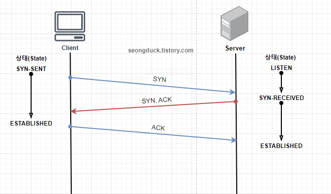 - 3번의 패킷을 주고받으면서 통신을 서로 준비하는 것을 뜻함