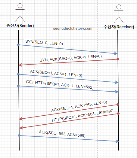 - 출발지에서 시퀀스 번호를 0으로 보냄(SEQ = 0)