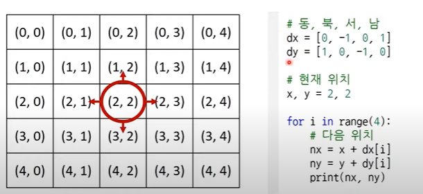 - 특정위치에서 시작해서 좌/우/상/하로 움직여 문제를 해결하는 것이 많다.