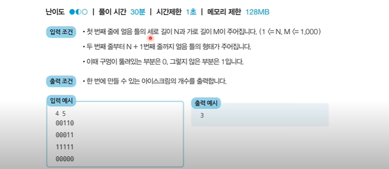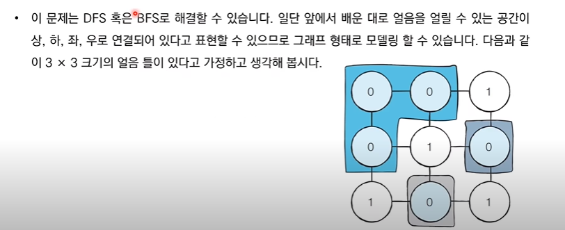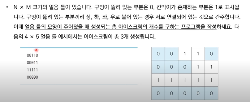 - DFS를 활용하여 특정한 지점의 주변 상, 하, 좌, 우를 살펴본 뒤에 주변 지점 중에서 값이 '0'이면서 아직 방문하지 않은 지점이 있다면 해당 지점을 방문