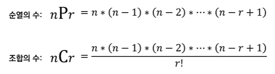- {'A','B','C'}에서 3개를 선택하여 나열하는 경우 : 'ABC', 'ACB', 'BAC', 'BCA', 'CAB', 'CBA'